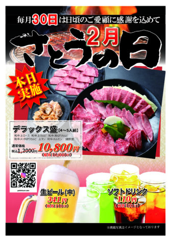 日頃のご愛顧誠にありがとうございます。2月は本日28日にさとうの日を開催いたします。 今月もお得なメニューをご用意しました!